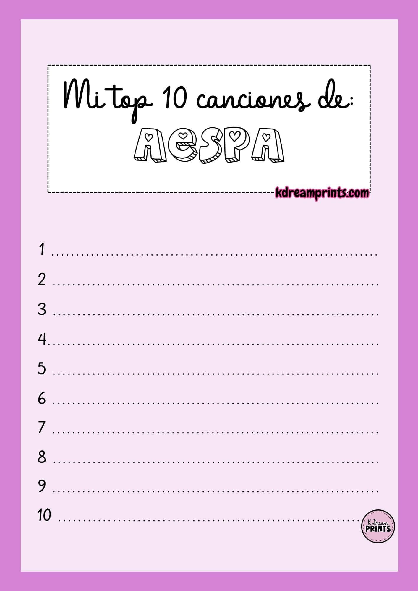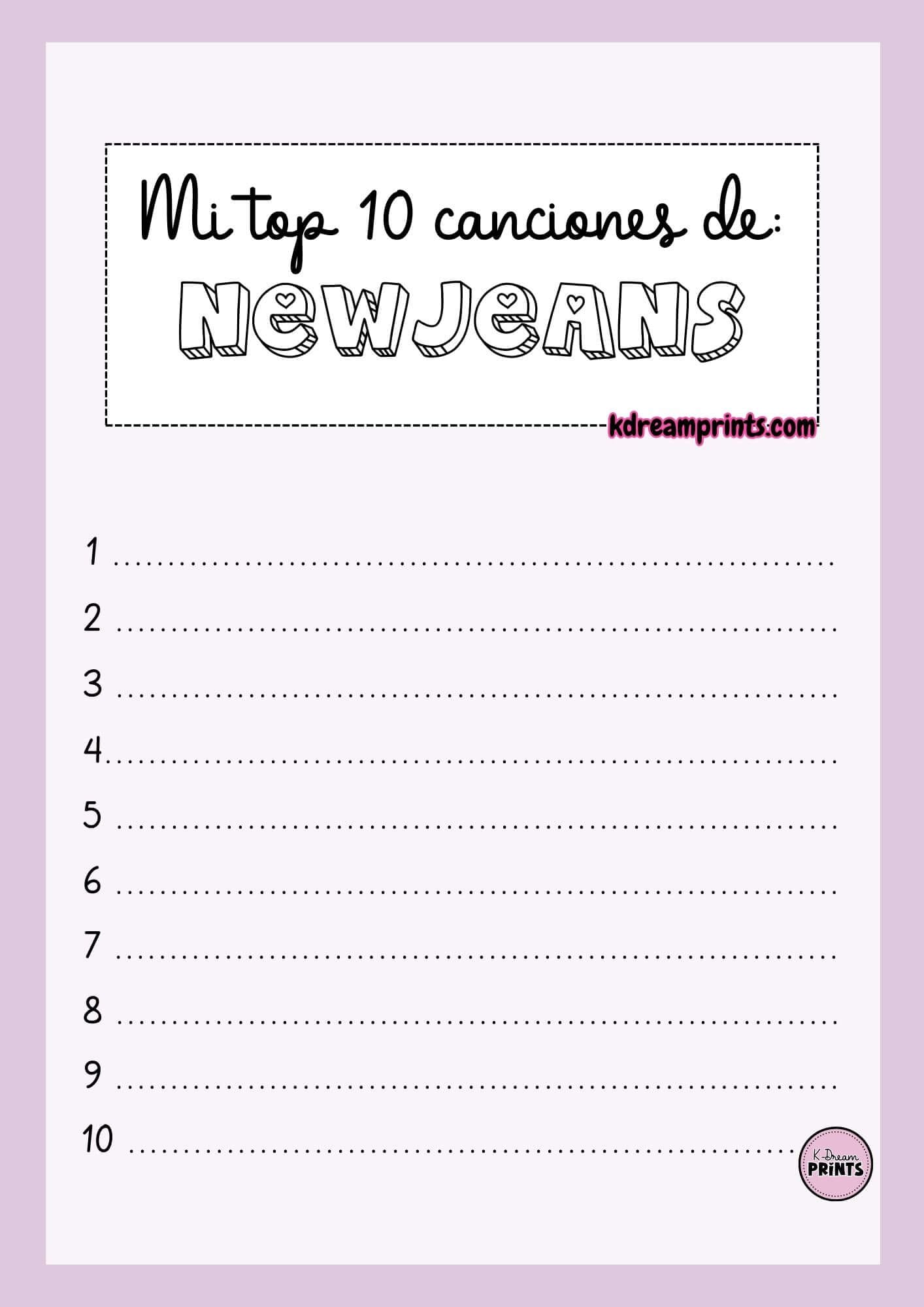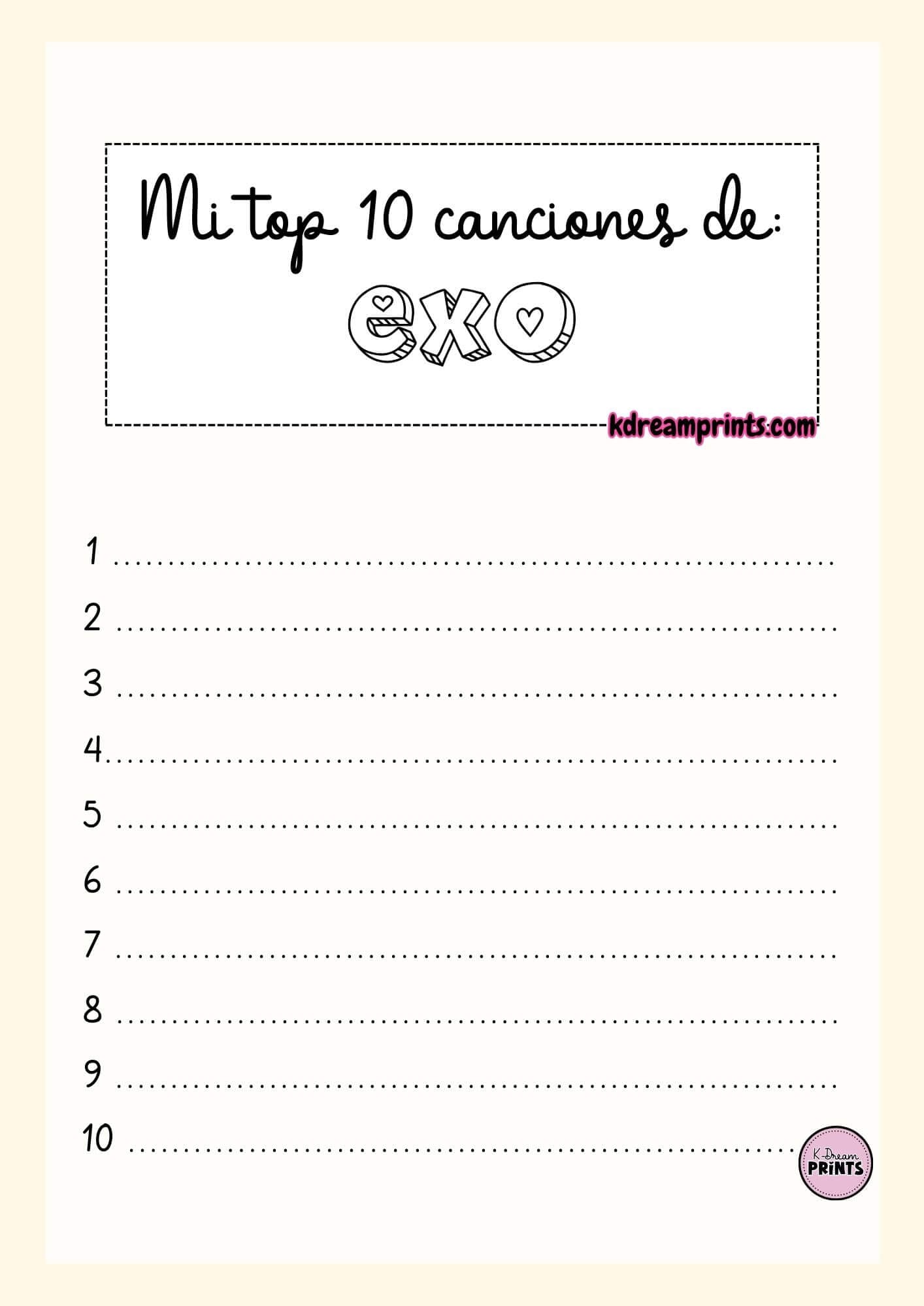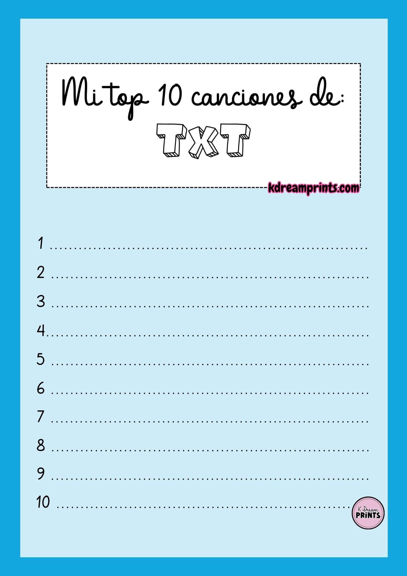 - Formato funcional y estético: Espacio suficiente para que escribas tus 10 canciones favoritas de cada grupo.
